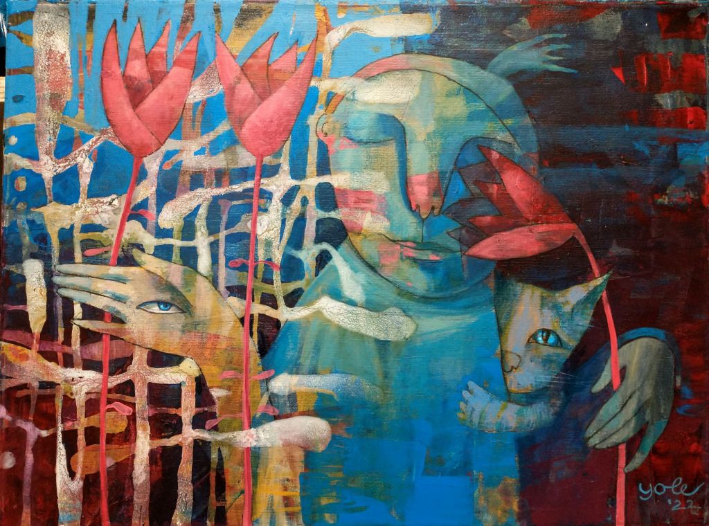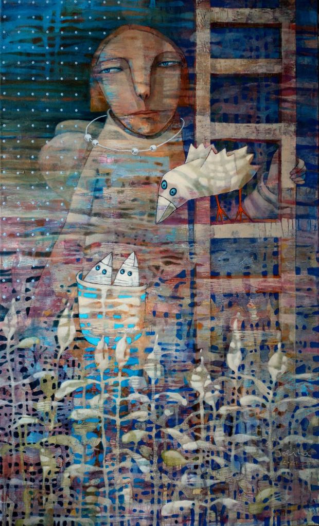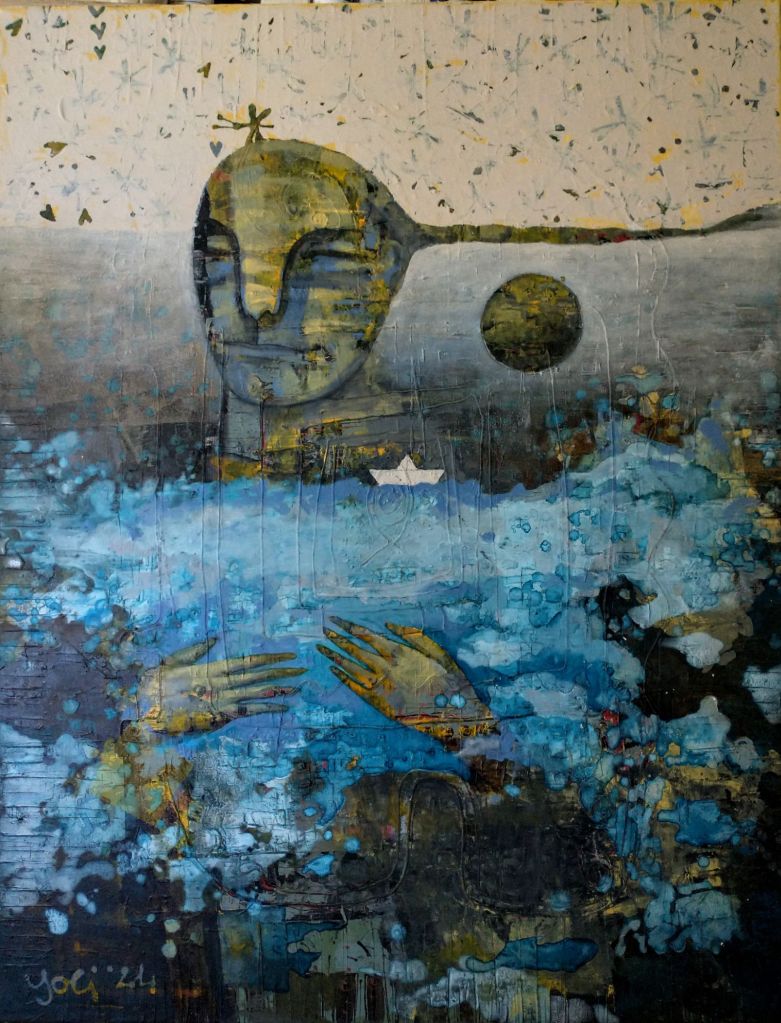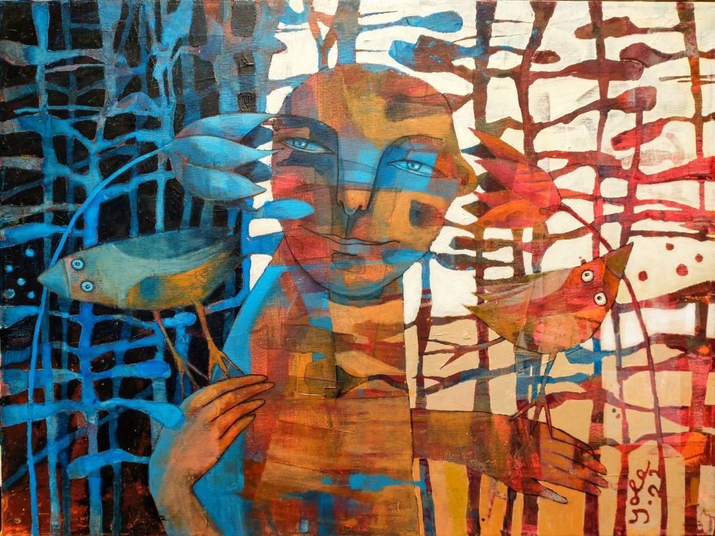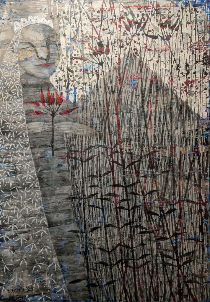“budinčios akys krapų sode”, drobė, akrilas, 120×100, 2024 m.