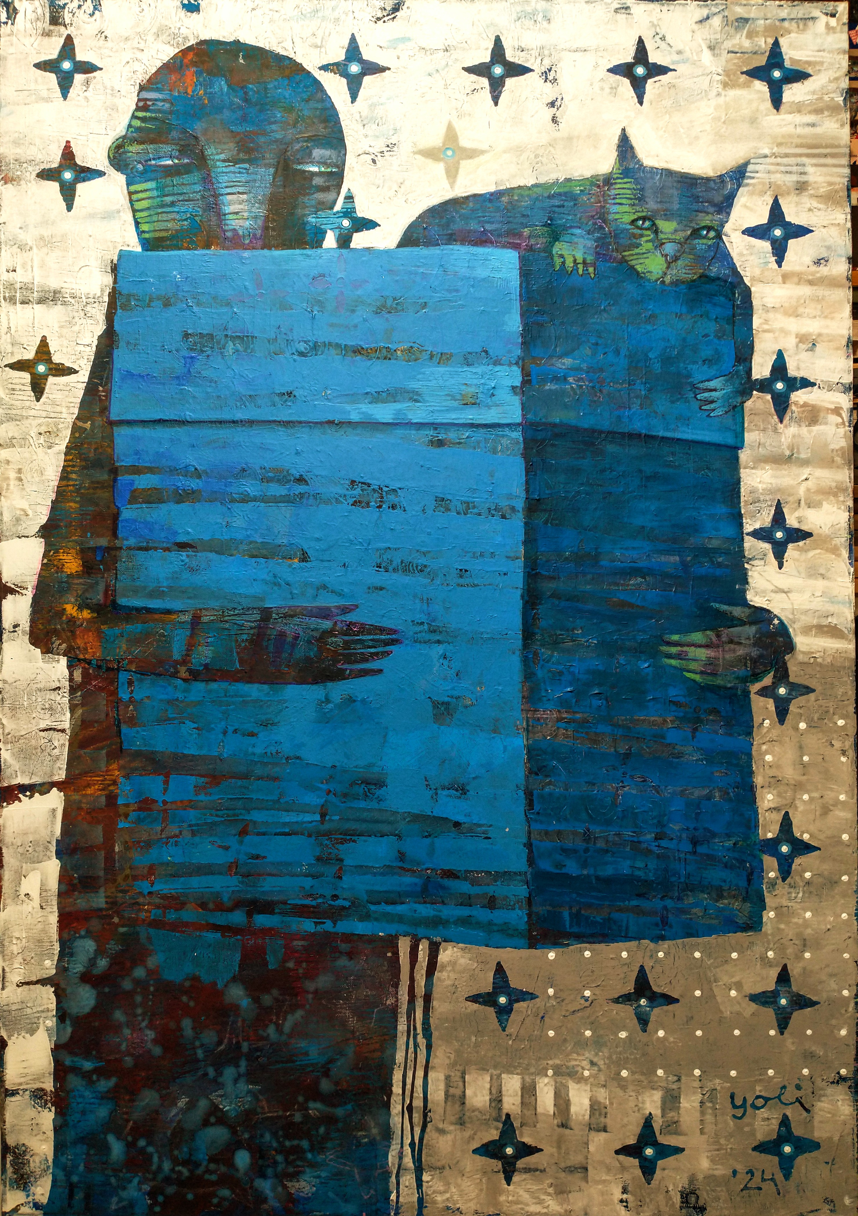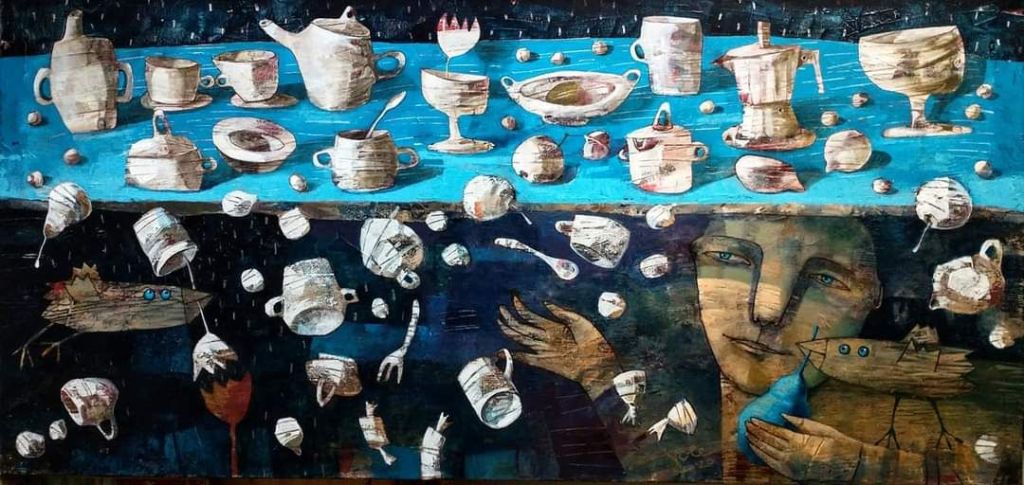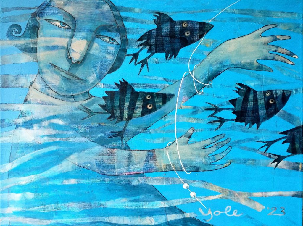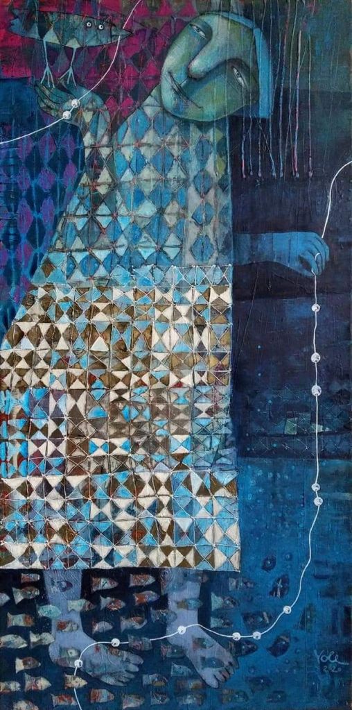 “budinčios akys krapų sode”, drobė, akrilas, 120×100, 2024 m.