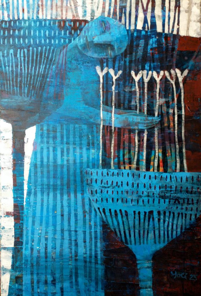 “pievininko ryto ritualas”, drobė, akrilas, 100×120 cm 2025 m.