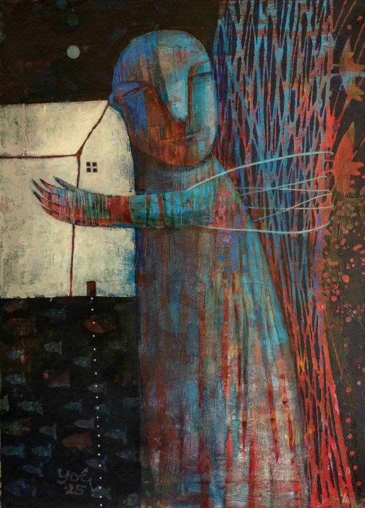 “gyvi mano namai”, drobé, akrilas, 70×90, 2025 m.